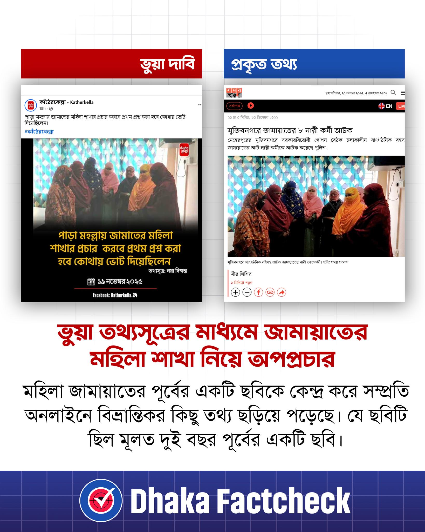 সম্প্রতি সামাজিক যোগাযোগ মাধ্যমে একটি ফটোকার্ড ছড়িয়ে দাবি করা হচ্ছে, “পাড়া মহল্লায় জামাতের মহিলা শাখার প্রচার করবে প্রথম প্রশ্ন করা হবে কোথায় ভোট দিয়েছিলেন।”