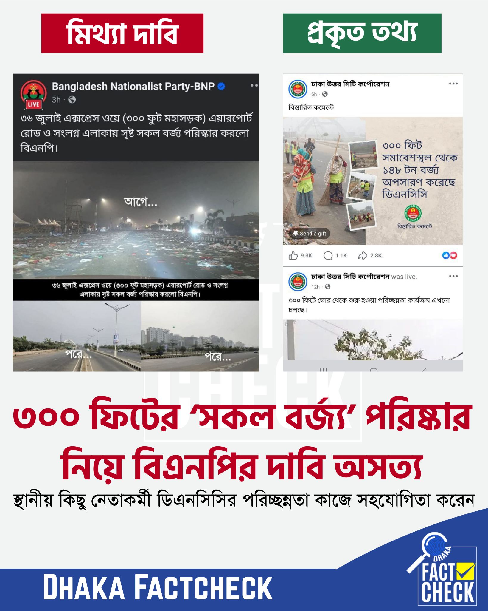 বাংলাদেশ জাতীয়তাবাদী দল বিএনপির ভেরিফাইড পেইজ থেকে দাবি করা হয়, ৩৬ জুলাই এক্সপ্রেসওয়ে (৩০০ ফুট মহাসড়ক) এয়ারপোর্ট রোড ও সংলগ্ন এলাকায় সৃষ্ট সকল বর্জ্য পরিস্কার করেছে বিএনপি। ঢাকা ফ্যাক্টচেক থেকে বিষয়টি সম্পর্কে খোঁজ নিলে জানা যায়, বিএনপির সকল বর্জ্য পরিষ্কারের বিষয়টি সত্য নয়। বিএনপি’র কর্মসূচিতে কিছু বর্জ্য পরিষ্কার করা হয় তবে সকল বর্জ্য পরিষ্কার করেনি বিএনপি। কারণ একই দিন একই স্থান থেকে ২০ টি ট্রাকে ১৪৮ টন বর্জ্য পরিষ্কার করেছে ঢাকা মহানগর উত্তর সিটি কর্পোরেশন (ডিএনসিসি)।