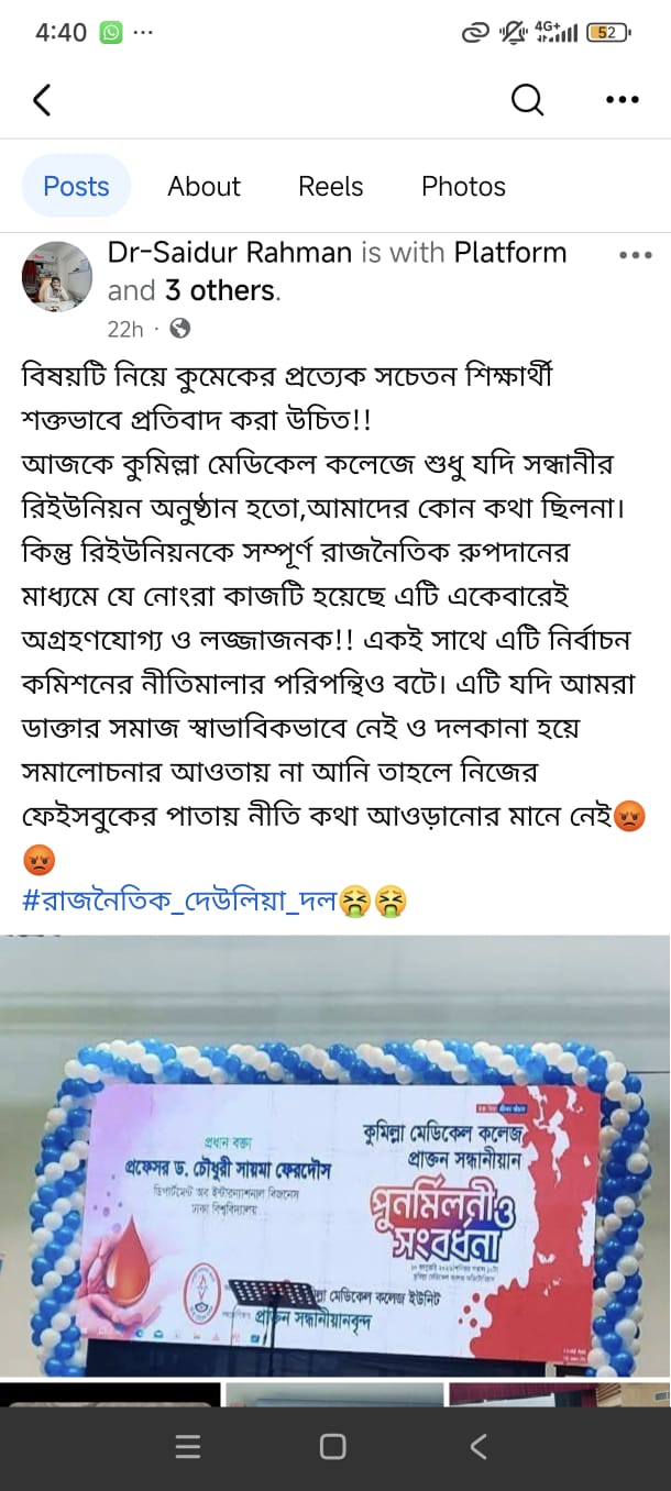 অনুষ্ঠানে নির্বাচনী প্রচারণা প্রসঙ্গে জানতে চাইলে তিনি বলেন, এখানে প্রোগ্রামের দুইটা সেগমেন্ট ছিল। এখন আমাদের এক্স-সন্ধানীয়ান যারা, তারা তো বিভিন্ন ক্ষেত্রে বিভিন্নভাবে পলিটিক্যাল বিভিন্ন সংশ্লিষ্টতা আছে। উনাদের যে সেগমেন্টটা ছিল, সেখানে লিফলেট দেওয়া হয়েছে। অডিটোরিয়ামে কুমিল্লা মেডিকেল কলেজের স্টাফ থেকে শুরু করে অনেক ধরনের অনেক লোকই ছিল। এইখানে স্টুডেন্টদের ওইভাবে দেওয়া হয় নাই।